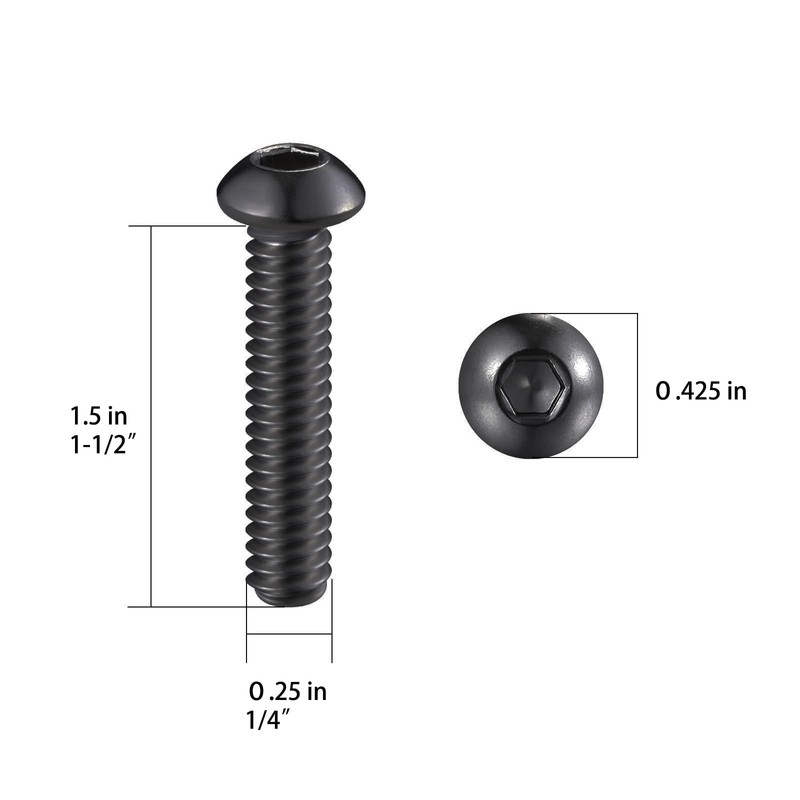 • Size: Thread Diameter: 1/4"; Thread Pitch: 1/20"; Screw Length: 1-1/2". Head Diameter: 0.425".