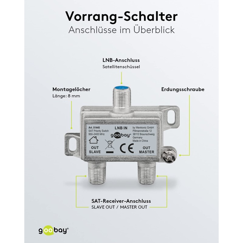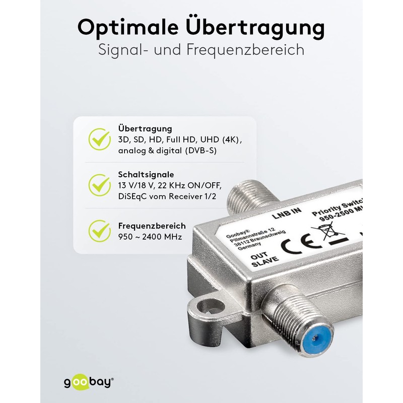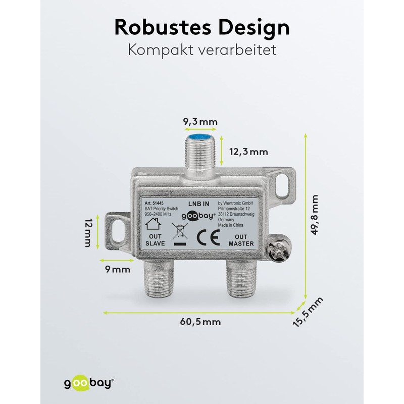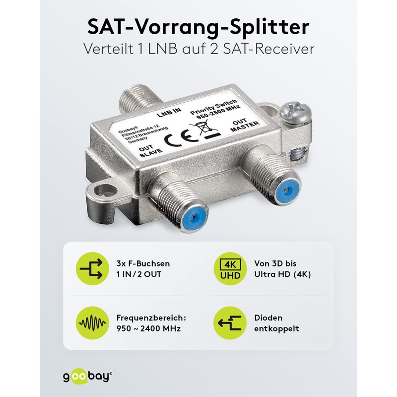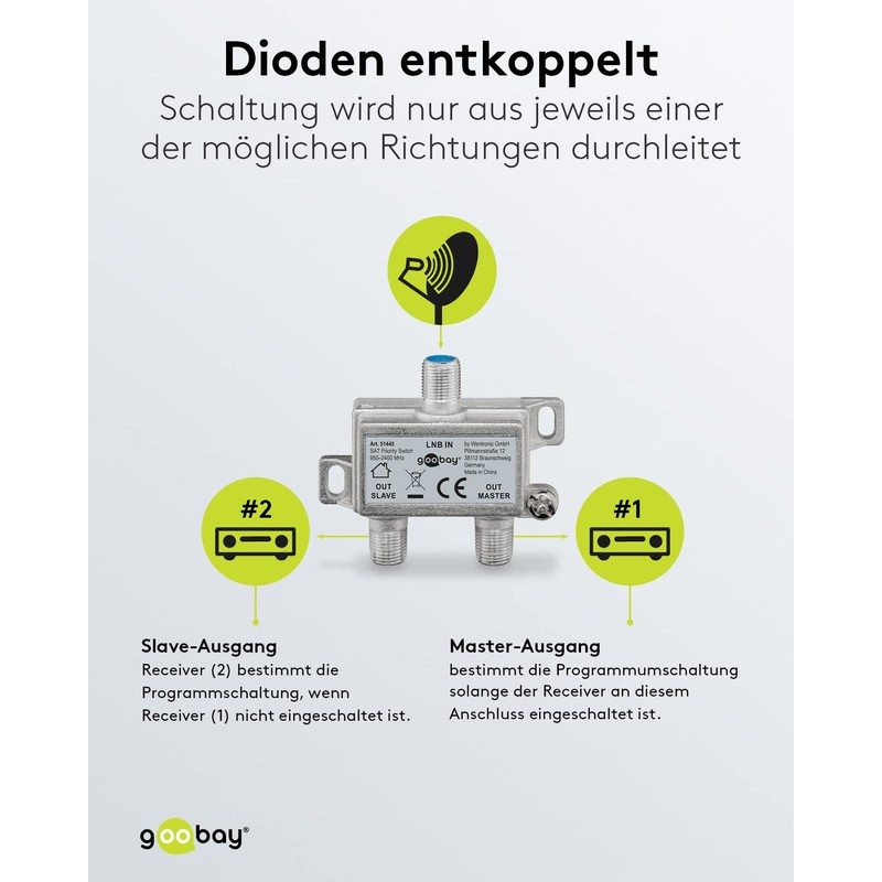 - Satellitenverteiler zum Anschluss von 2x Satelliten Receivern an 1x Koaxial Leitung; SAT Kabel Splitter verfügt über eine passgenaue Master-Buchse und einen Slave-Anschluss
