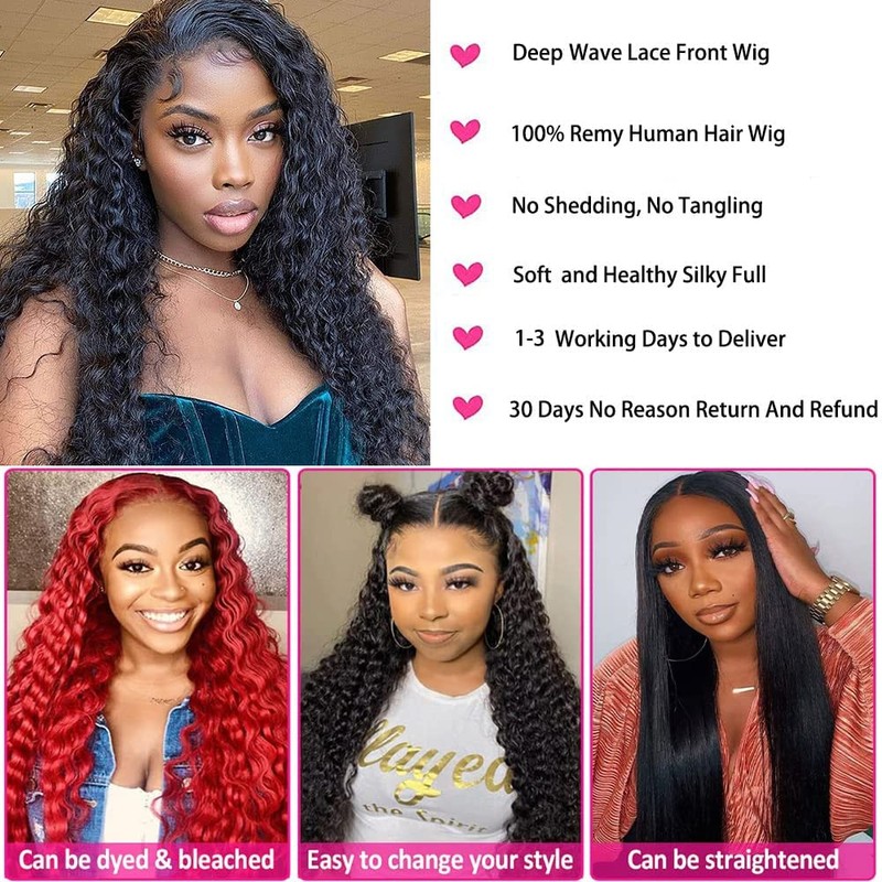 - Hair Texture: Gorgeous natural deep wave lace front wig human hair, minimum shedding ,no tangle. This wig can be dyed, bleached, straightened, curled, highlighted, colored and styled as you like