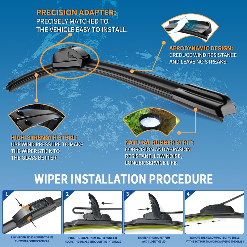 - 100% QUIET: Our Windshield wiper blades design is excellent. Natural rubber can effectively eliminate the annoying noise during work, will not affect the sleeping baby in the car