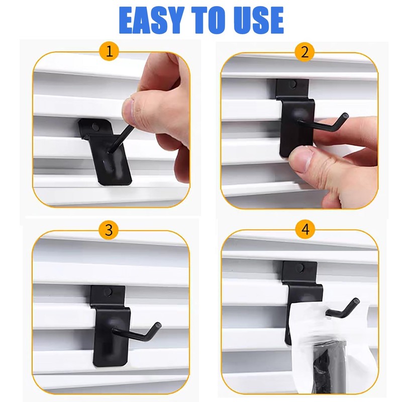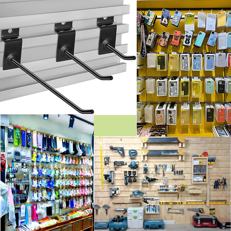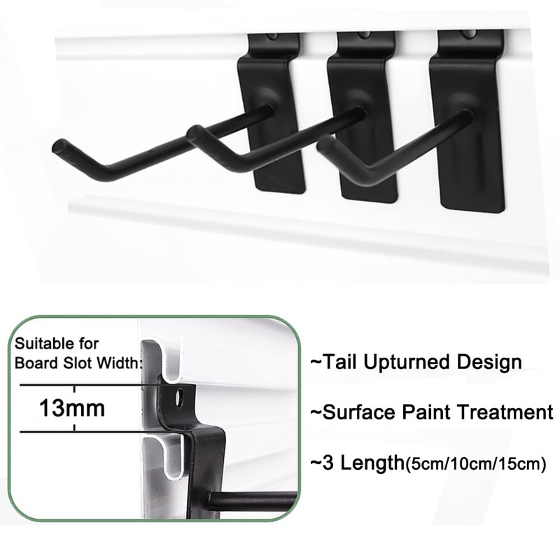 - Package Content Total 20 pieces slatwall hooks, including 8 pieces 50mm hooks, 8 pieces 100mm hooks, 4 pieces 150mm hooks. They are suitable for the board slot with a width of 13 mm.