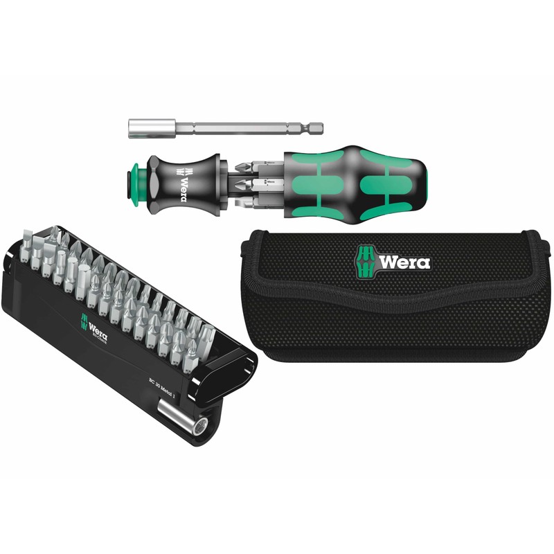 With the Wera Kraftform Kompakt 28 and the Wera Bit-Check 30 Metal 1, you have the perfect combination of quality and versatility. The Kraftform Kompakt 28 offers an ergonomic design and high-quality workmanship for comfortable and efficient work. The Bit-Check 30 Metal 1 includes a selection of Wera's most robust bits that come in a compact box for easy storage and transport. Features: Hex-Plus makes hexagon socket screws live longer - Especially for metal applications - Tough bits, for universal use - Universal holder with stainless steel sleeve - Multi-component hand holder with roll protection - With bayonet blade and integrated bit magazine - Connection part bayonet, with stainless steel sleeve and strong permanent magnet - Suitable for bits with 1/4 inch hexagonal drive. Box contents: - Handholder, with Bayonet blade and integrated bit magazine - universal holder, 1/4 inch x 50 mm - cross bits, 25 mm: 4x PH1, 4x PH2, 2x PH3 - Phillips bits, 25 mm: 4x PZ1, 4x PZ2, 3x PZ3 - inner star bits, 25 mm: TX10, TX15, TX20, TX20, TX. 25, TX3, TX0, TX40 - slotted bits, 25 mm: 0.6x4.5, 2x1x5.5, 2x1.2x6.5 - hexagon socket bits, 25 mm: 4, 5, 6 - Velcro strips: 70x50 mm - bag