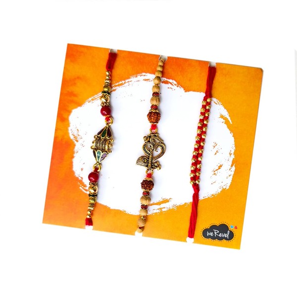 weRevel Rakhi Set of 3 – Damru, Om with Rudraksha & Red Thread Rakhi Combo – Traditional Raksha Bandhan Rakhi Set with Spiritual Charm