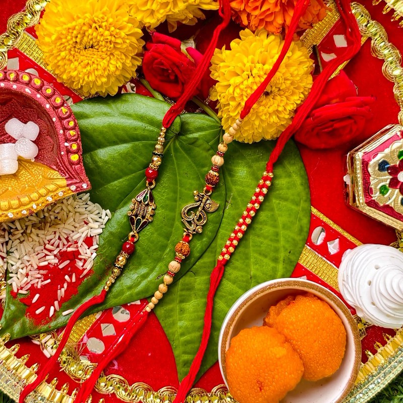 - Rudraksha Rakhi – Adorned with natural rudraksha and wooden beads, representing peace, protection, and divine blessings.