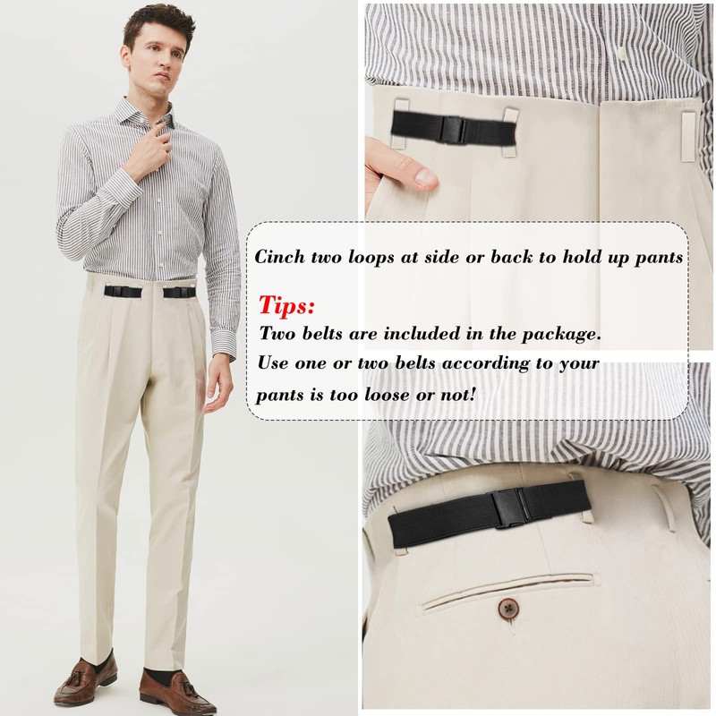• ✌2 Loop No Buckle Belt: You could put this new design no buckle pants jeans waist tightener half belt anywhere (front, side & back) between two loops of you pants or jeans. Pretty ingenious idea! There are 2 belts in the package, If your pants/jeans is not so loose, you could only use on belt to hold up your pants well! If your pants/jeans is very loose, we suggest that you could use two belts on each side to keep your pants/jeans in place well.