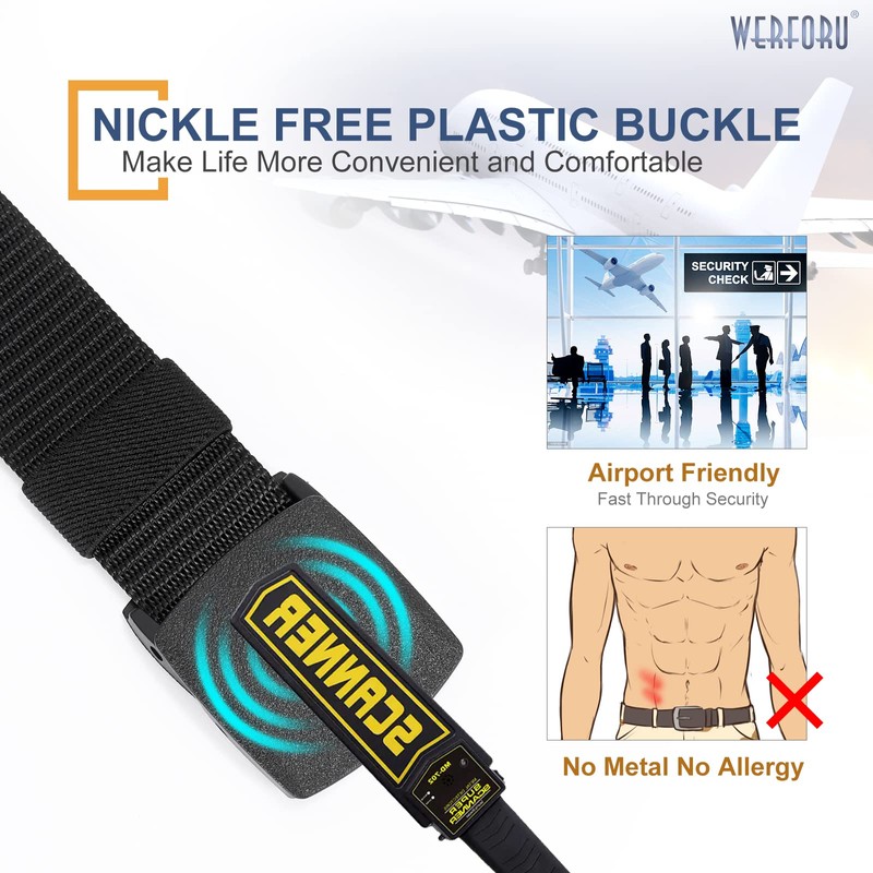 - PLASTIC BUCKLE DESIGN---Designed with metal-free plastic buckle, which is not easy to crack and breakage. Nickel free plastic buckle, feel comfortable and easy to wear. Non-metallic buckle belt allow you a easy/quick clearance at the security checkpoint at the airport. And especially suitable for metal allergy to wear.