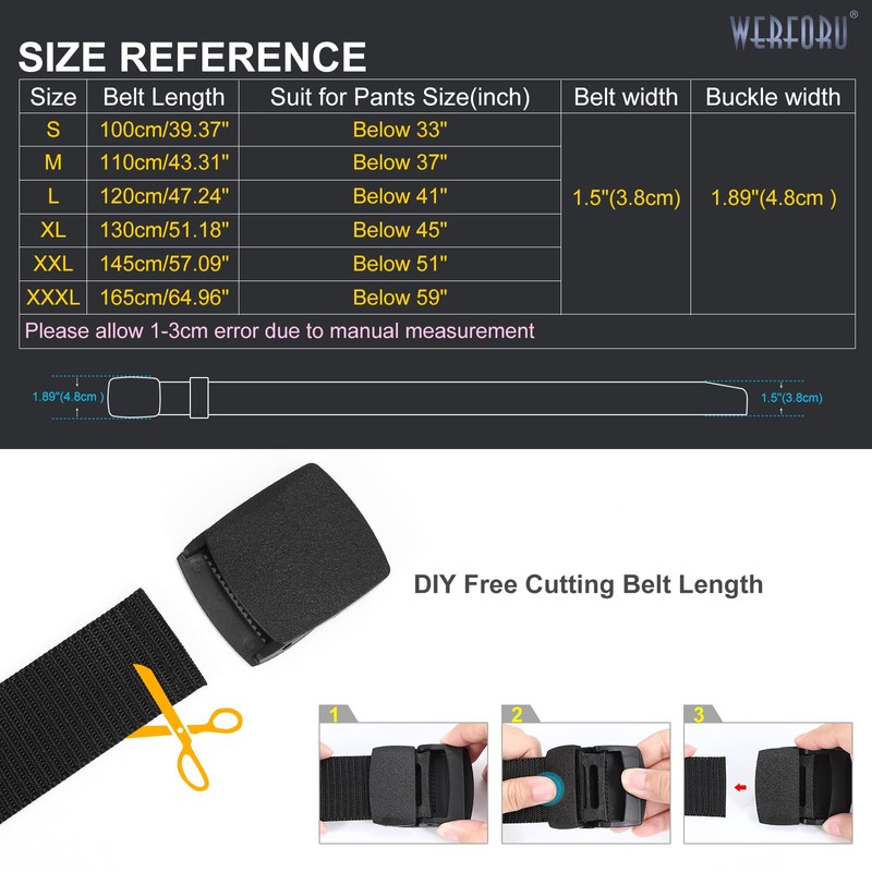 - FULLY ADJUSTABLE---6 size for your choice,meet most people needs. Belt strap width is 1.5 inches,easy to pass through most pants. No holes belt design, so its tightness and length can be adjusted freely to meet different wearing requirements. If the strap is too long for you, you can trim the strap length to fit your size. The ratchet buckle design makes the belt non-slip, stay tight full day.