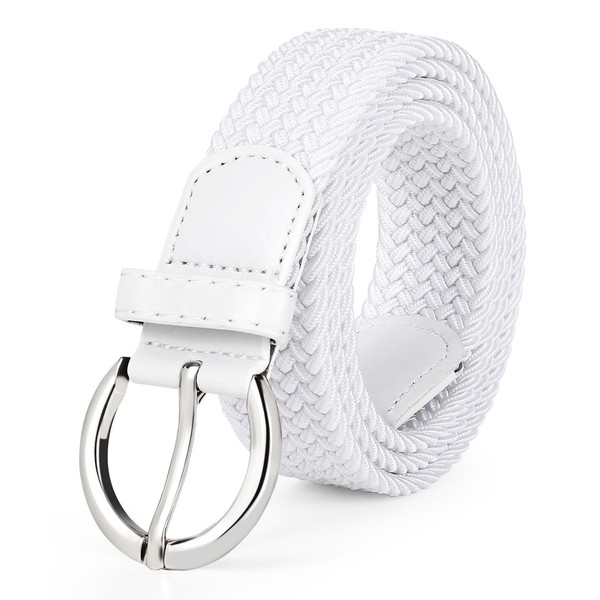 WERFORU Ladies Stretch Belt with Silver Buckle Women's Elasticated Woven Braided Belt for Jeans Pants White