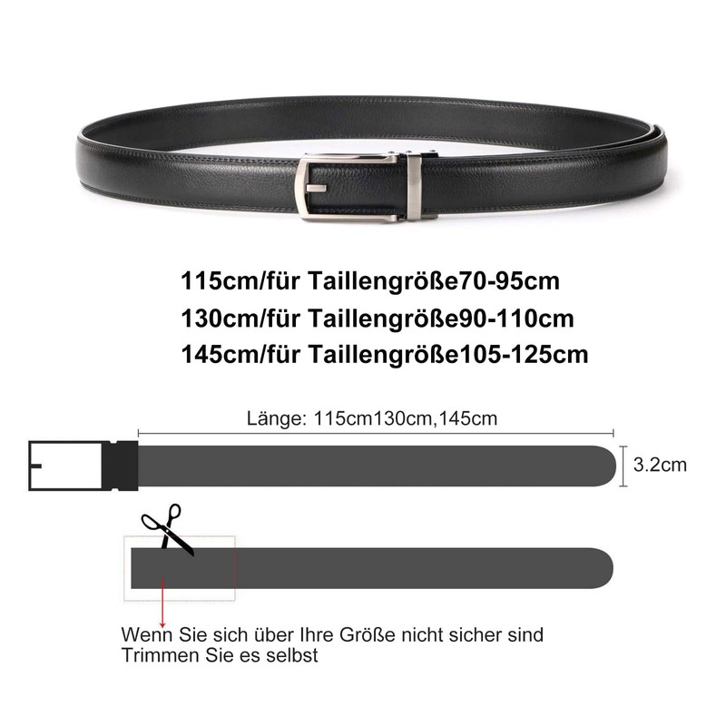 - Order with decency - Our goal is that you are satisfied with our men's ratchet belts. These ratchet belts fit most sizes. Size S: 115 cm/45.28 inches (for waist circumference 70-95 cm); Size M: 130 cm/51.18 inches (for waist circumference 90-110 cm); Size L: 145 cm/57.09 inches (for waist circumference 105-125 cm).