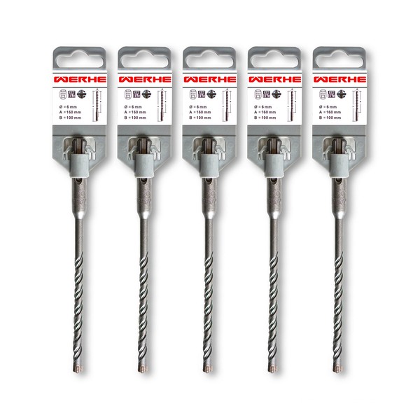 WERHE ® SDS Plus Professional 5-Piece Concrete Drill Bit 6 x 160 mm Hammer Stone Concrete Quadro X Quadro X Quadruple Cutting Blade Cross Blade