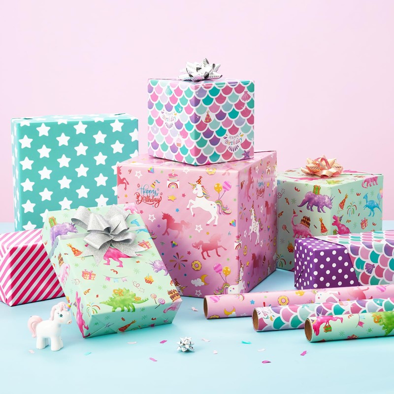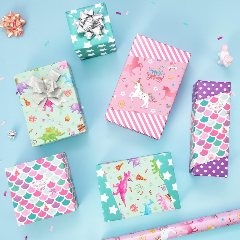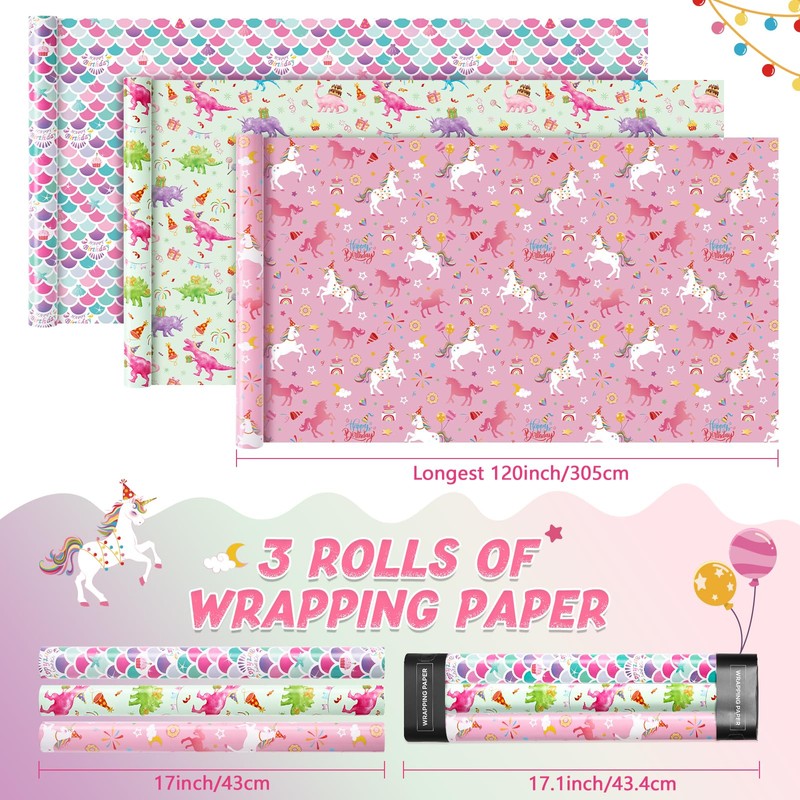 - 3 ROLLS WRAPPING PAPERS - This girls birthday wrapping paper set includes 3 rolls of wrapping paper in different patterns, unicorns, mermaids, and dinosaurs. Each roll measures 17" x 120", ensuring all of your gift wrapping needs are met.