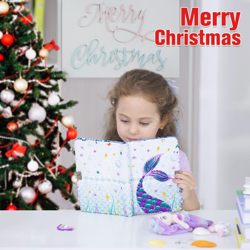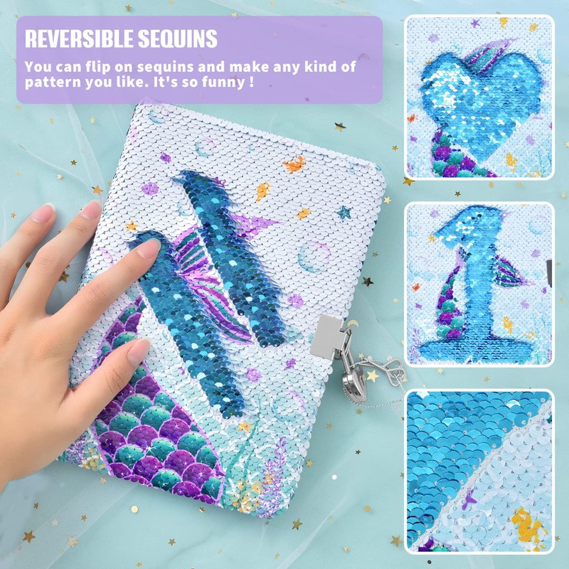 WERNNSAI Mermaid Sequins Notebook - Reversible Mermaid Journals Unique Gift for Girls Travel School A5 Secret Diary Notebooks with Locks and Keys