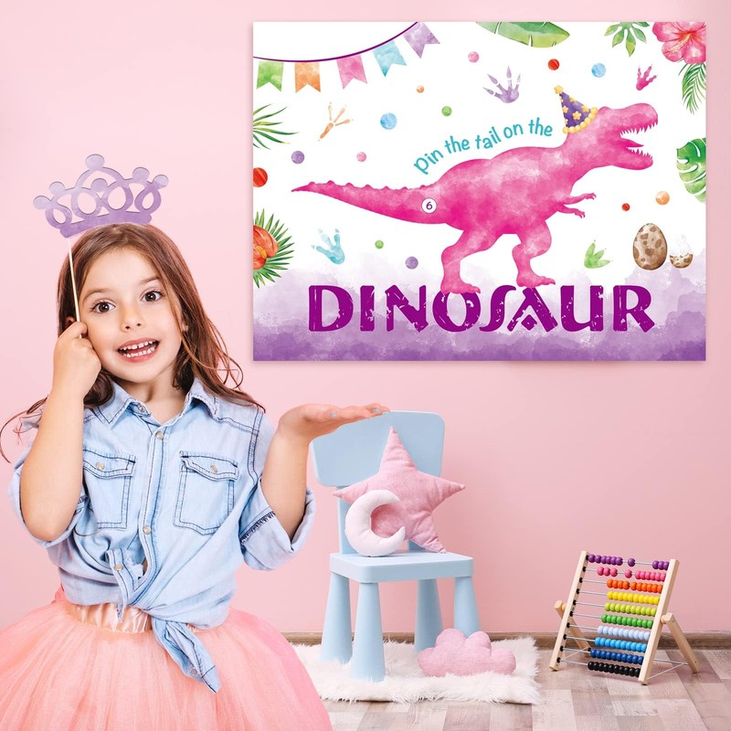 -All of dino girl fans will fall in love with our carton-style dinosaur theme party game. -The 24 pink tails are easy to stick and peel off, they remove from the poster without leaving a trace, so you can play with your friends many times.