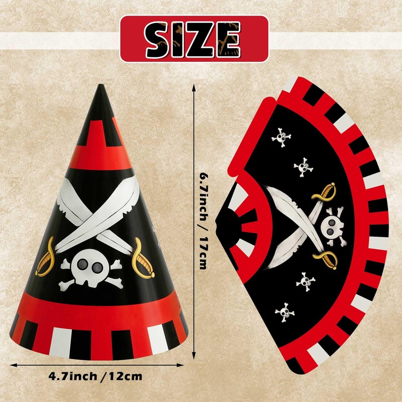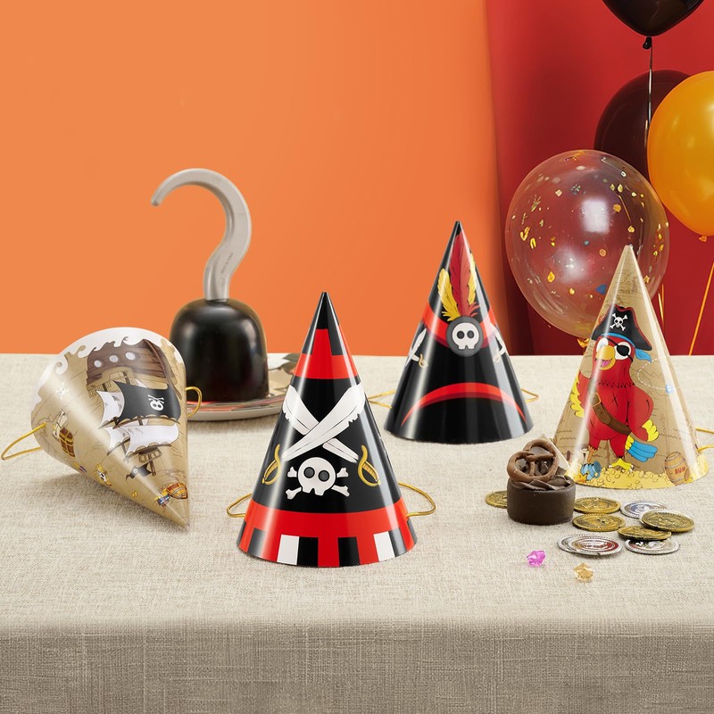 - 【PIRATE PARTY SUPPLIES】 - These colorful pirate party hats designed in 4 different patterns, catering to the preferences and dress code of the party guests. The birthday hats features classic pirate and sailing elements, add a touch of fun vibe to your kids party and leave your guests with an unforgettable impression