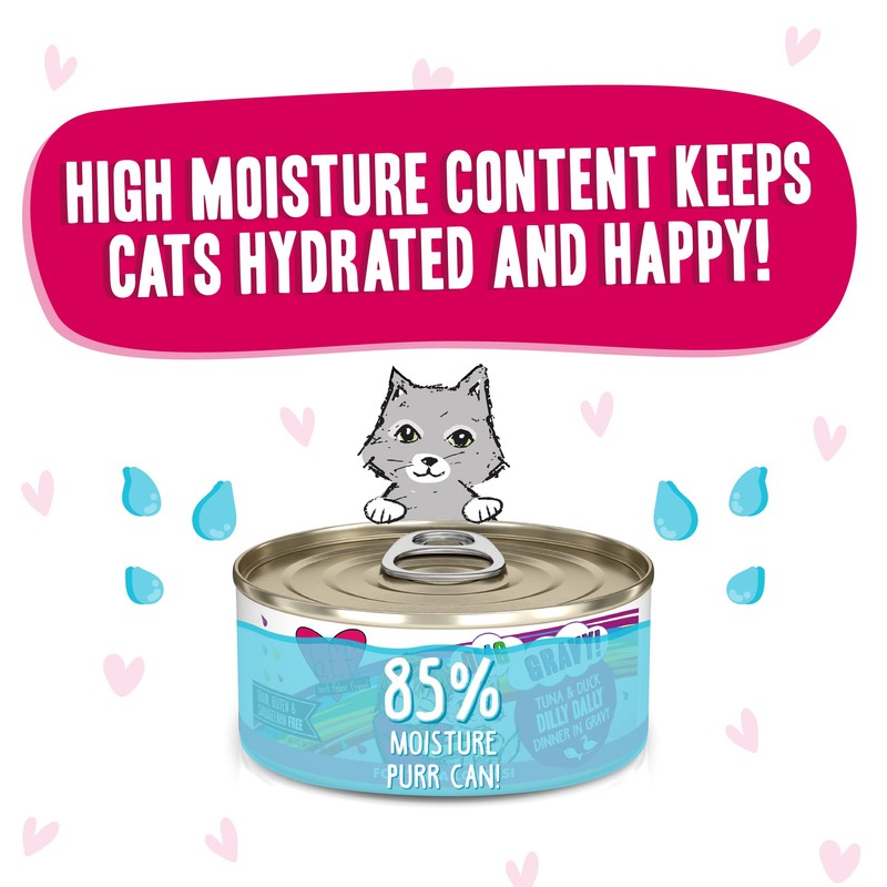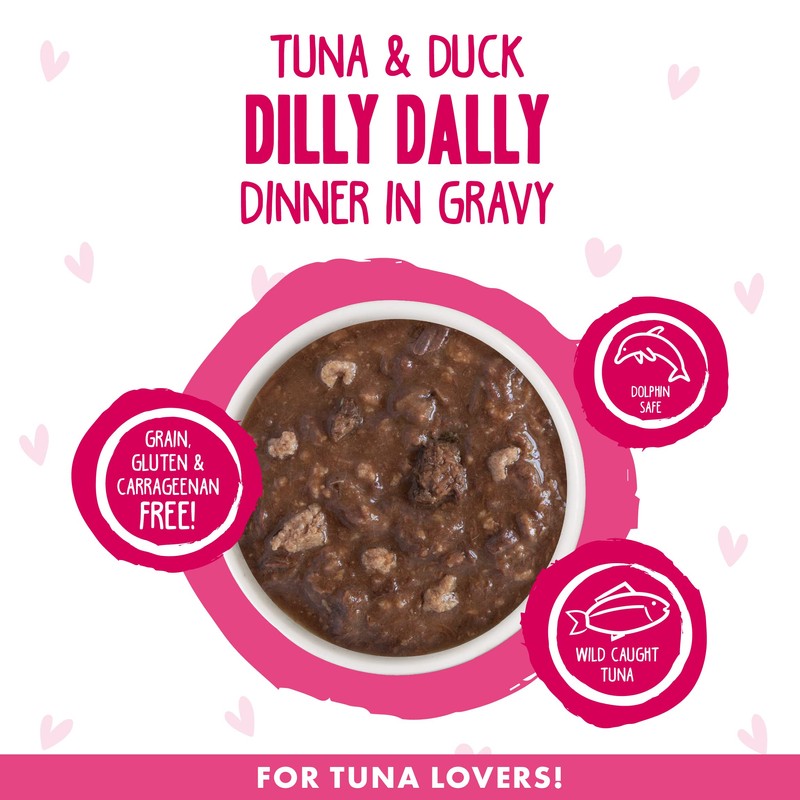 - Tuna & Duck Dilly Dally (5.5oz Can, Pack of 8) Red-meat tuna, and cage-free duck in a tasty gravy.