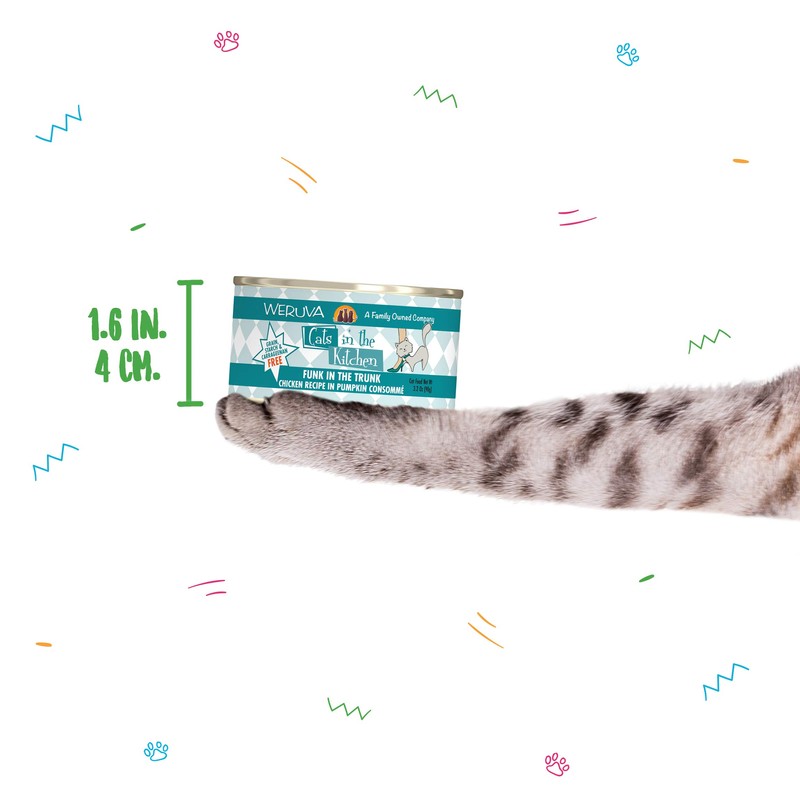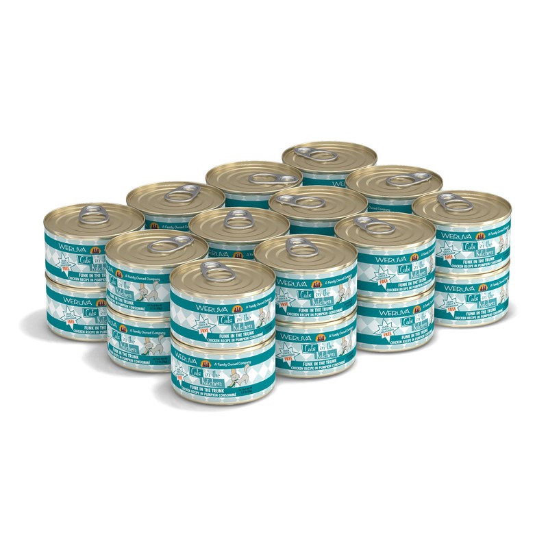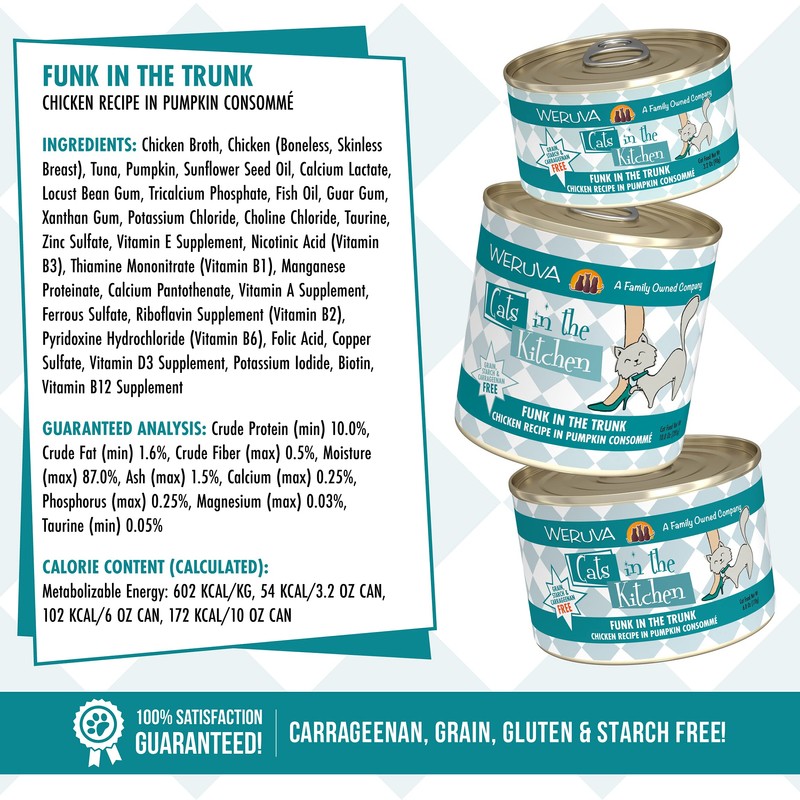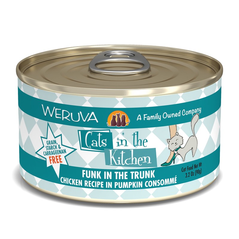 Meet Weruva, Makers of Cats in the Kitchen: Weruva was founded over ten year’s ago by David & Stacie Forman and is still proud be family owned and operated. WeRuVa was inspired by and named after the founder’s three rescued cats; Webster, Rudi and Vanessa. With the search for “The Best Cat Food Under the Sun” never seeming to end, David & Stacie thought, “Let’s give it a shot ourselves…” and gathered the best ingredients from around the world, formulated some fantastic recipes and created Weruva. Naturally, when they were lucky enough to have their rescued dog Baron enter the family, they decided to expand our products to include dog food. Our desire for more innovative, healthy pet products could not be stopped and we continued to dream up and produce some of the best products for pets and their people. Today, we have expanded our product offerings to include four cat wet food brands, two dog wet food brands, dry dog food, treats, pumpkin supplements and even litter! Quality Control, Safety & Ingredients: Weruva always strives to be more than just a pet food company. We are obsessive over Safety and Quality Control and only produce our products in BRC/USDA Approved Facilities; arguably the highest standards for human-food production. We also source responsible and sustainable raw materials. You will be happy to know Weruva uses Cage-Free Chickens, Grass-Fed Beef & Lamb, and Wild-Caught Fish. Did we mention everything is GMO-Free? Learn About Cats in the Kitchen Grain-Free Cat Cans & Pouches: The kitchen is so often the heart of the home. It is where our family gathers for meals, where we have our game night, where family bonds grow.We eat there, we laugh there—we feed our pets there. The inspiration for these delectable selections come from feeding our precious Cats in the Kitchen. Bring your cats to the heart of your home and share with us these savory cuts of white breast meat chicken and duck breast . . . delicate gravies, some with pumpkin for healthy digestion . . . loins from tuna, salmon and mackerel . . . and lean cuts of beef —all fit for our kitchen carnivores. These recipes are among our most delicious offerings. We hope your kitties love Cats in the Kitchen as much as the WeRuVa cats do—Webster, Rudi & Vanessa approved! How is Cats in the Kitchen Different? CITK is a cross between Weruva and BFF--pouches contain boneless, skinless white breast meat chicken, fish loins and a few formulas in pumpkin soup. The cans contain similar ingredients, but we’ve added in novel proteins like lamb and turkey, and included some dark meat chicken. The cans feature fish oil. Unlike Weruva, some formulas combine the chicken and fish. **Guaranteed Analysis:** Crude Protein (min) 10%, Crude Fat (min) 1.6%, Crude Fiber (max) 0.5%, Moisture (max) 85%, Ash (max) 2.0%, Calcium (max) 0.3%, Phosphorus (max) 0.03%, Magnesium (max) 0.03%, Taurine (min) 0.05% **AAFCO Statement:** This cat food is formulated to meet nutritional levels established by the AAFCO cat food nutrient profiles for adult maintenance.