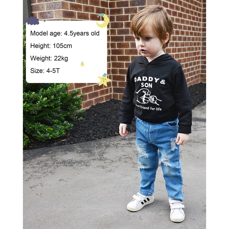 - Package include: 1* toddler boy long sleeve hoodies, 1* ripped jeans pant. Perfect 2pcs outfits set for toddler boy 1-5T.