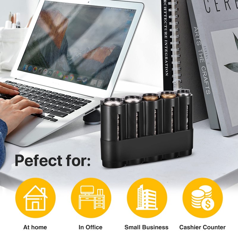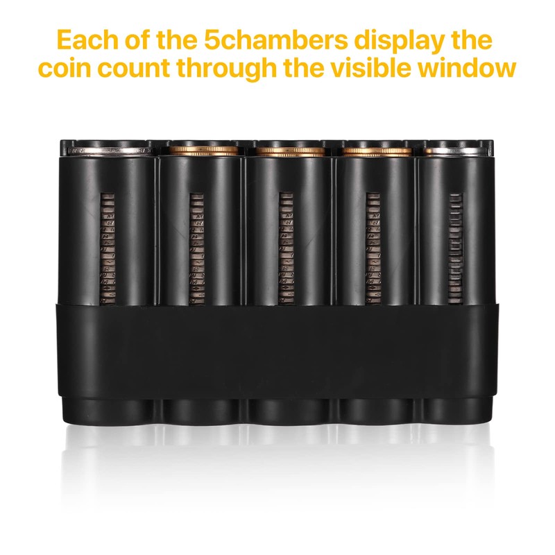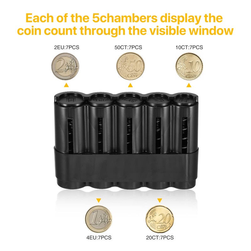 - 5 coin designations == This coin sorter contains 5 Euro coin designations (2EU, 4EU, 50CT, 20CT, 10CT) multi-layer stackable storage capacity. The coins can be separated and placed in order and can be quickly taken out when money is needed.