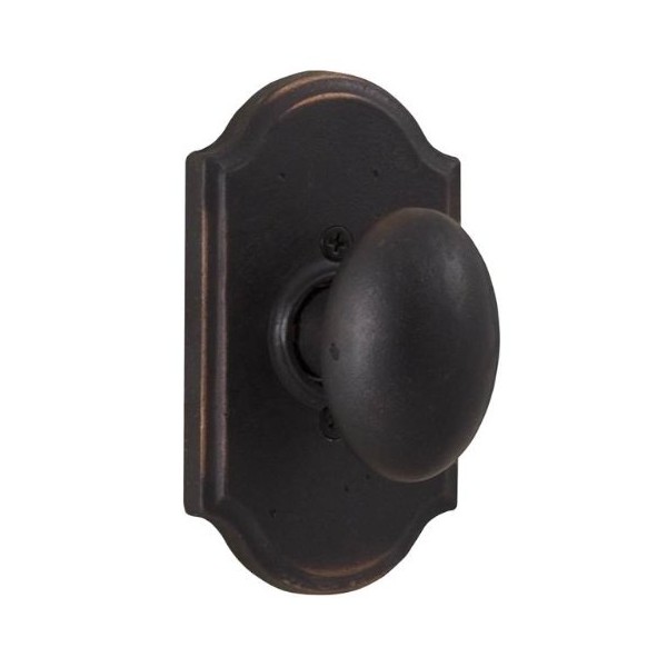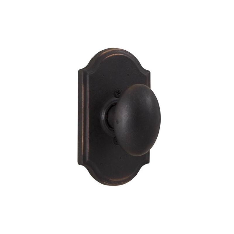 For over 60 years, Weslock has been providing homeowners with quality ANSI grade 2 door hardware utilizing our unique push-button safety feature. Weslock also features all metal parts, ease of installation, panic-proof privacy/keyed entry locking, removable knobs and levers, and dual spindles. Molten Bronze dummy lock with a Durham knob on a Premiere rosette finished in Oil Rubbed Bronze. The solid Molten Bronze rosettes, knobs, and levers have a living oil rubbed finish that reveals a deep red hue. The half dummy function is ideal for doors where only a pull function is needed, like pantry or closet doors with no holes.