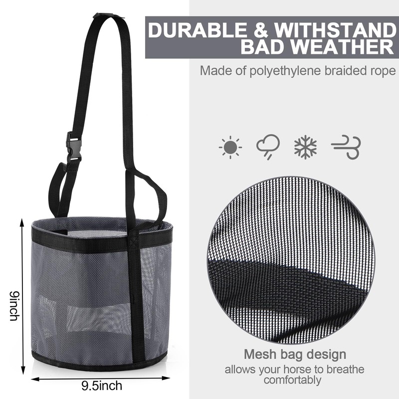 - Quality Material: crafted from breathable, durable, and weatherproof polyester, these horse feed bags promise longevity; The sturdy, weatherproof, and waterproof material of these feed buckets for horses ensures repeated use while maintaining quality