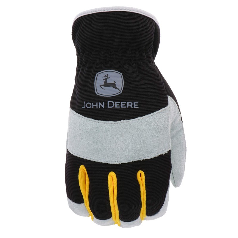 West Chester John Deere JD86020-L Split Cowhide Palm Gloves – Yellow/Grey/Black, Large Spandex Back Gloves with Shirred Elastic Wrists