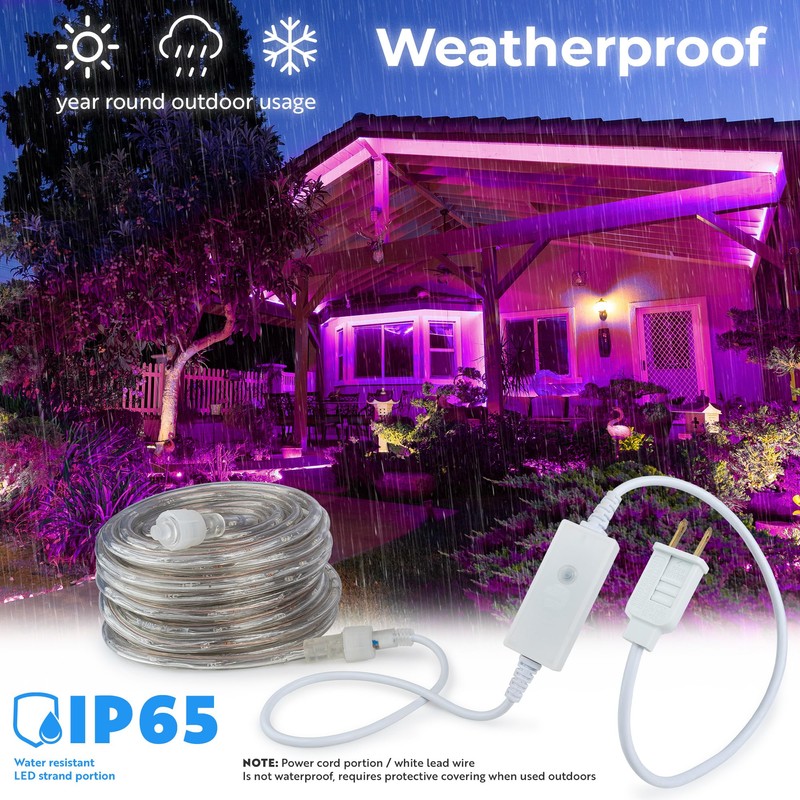 - IP65 rated light strand with 360-degree flexibility. Durable clear PVC tubing allows bending at any angle (minimum 1.5cm diameter). Withstands temperatures from -20°C to 50°C for versatile outdoor use. Energy-efficient design runs cool and reduces costs. Note: IP65 rating applies to the light rope only, not including the power plug