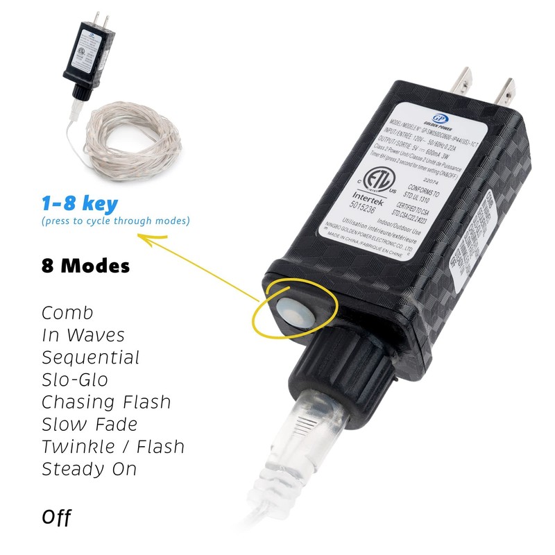 - 8 MODES w/ TIMER: 8 different flickering and fading settings. Simply press the button on the plug to change modes - Combination | Waves | Sequential | Slow-Glow | Chasing Flash | Slow Fade | Twinkle Flash | Steady On. To turn ON/OFF 6H timer, press the mode button for 2 seconds