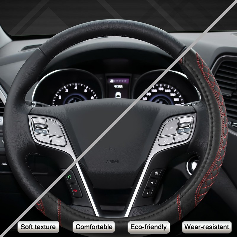 - 【HIGH-QUALITY MATERIAL】 This steering wheel cover is made of high-quality leather, which is soft texture, comfortable, eco-friendly, wear-resistant, and durable.