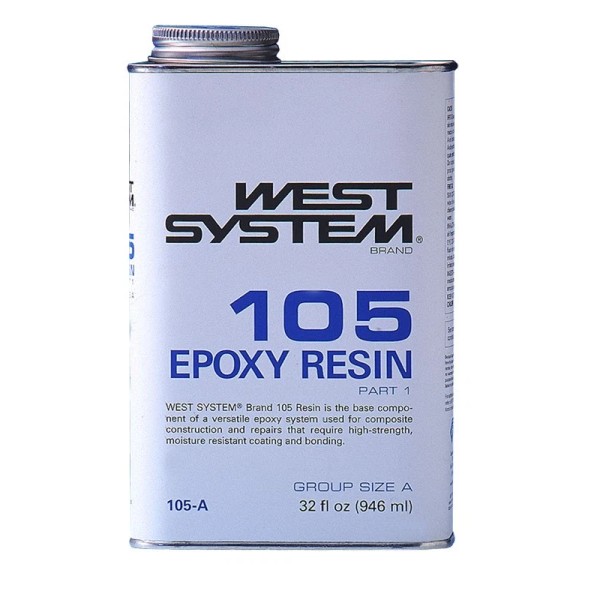 West System 105-A Epoxy Resin 32-oz. Container. 105 Epoxy Resin® is the base material on which all West System 105 System epoxy compounds are built. The resin is a clear, pale yellow, low-viscosity liquid epoxy resin. Formulated for use with West System hardeners, it can be cured in a wide temperature range to form a high-strength solid with excellent moisture resistance.