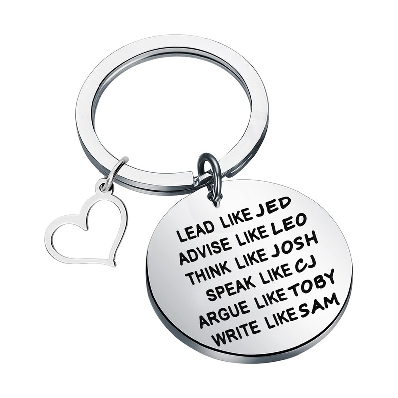 • Engraved with the sentence "LEAD LIKE JED ADVISE LIKE LEO THINK LIKE JOSH SPEAK LIKE CJ ARGUE LIKE TOBY WRITE LIKE SAM". We only stamp on one side of the keychains!