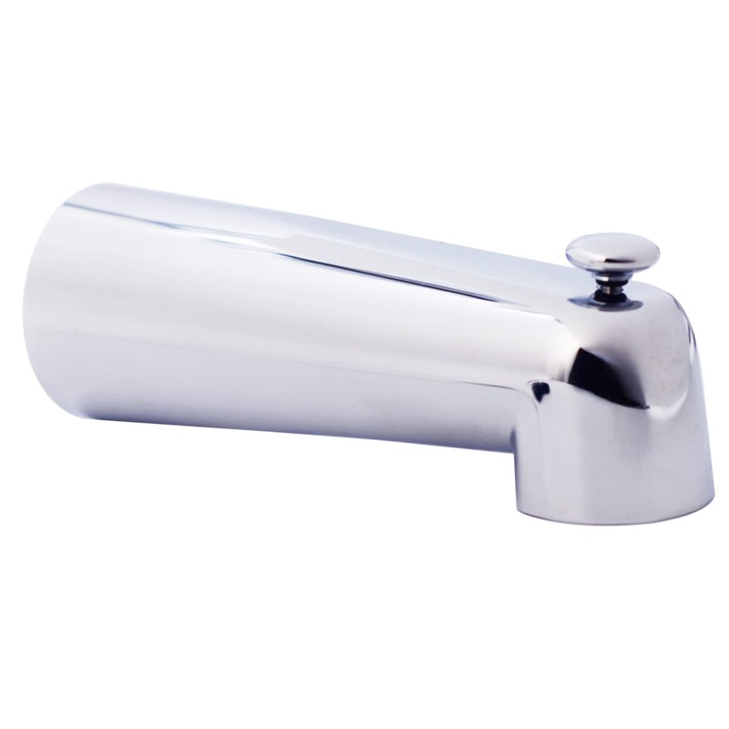 7 in. long, 1/2 in. IPS, front inlet, diverter zinc tub spout. Fully finished exterior. Slightly deeper spout for wider tub decks; to prevent splashing. Diverter spout for shower operation.