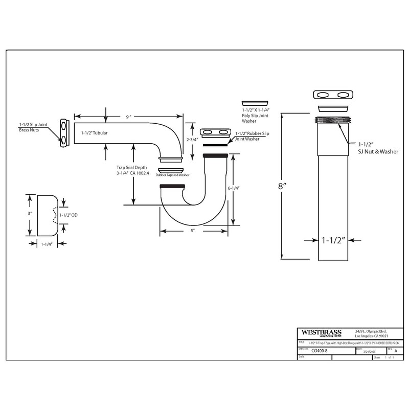 Westbrass CO400-8-01 1-1/2" Brass Bathroom Sink P-Trap with 8" Slip Joint Extension Tube, Polished Brass