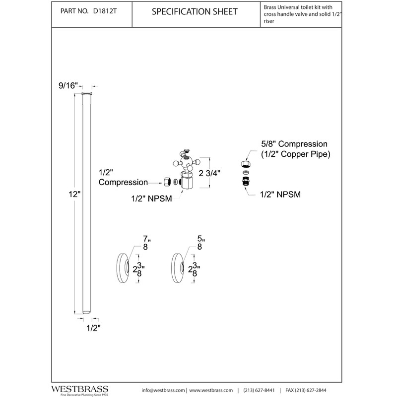 Westbrass Toilet Kit with Stop and Flat Head Riser with Cross Handle, Polished Brass, D1812T-01