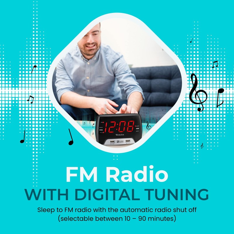 Westclox Large 1.4” Red LED Digital FM Clock Radio with Dual USB A & C Charging Ports, Adjustable Brightness, Dual Alarms & Sleep Timer – Modern Alarm Clock for Bedroom, Home, or Office (Black)