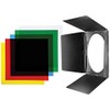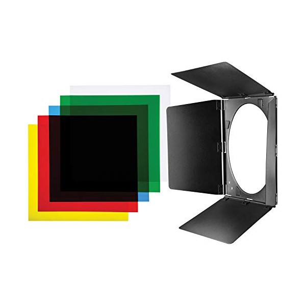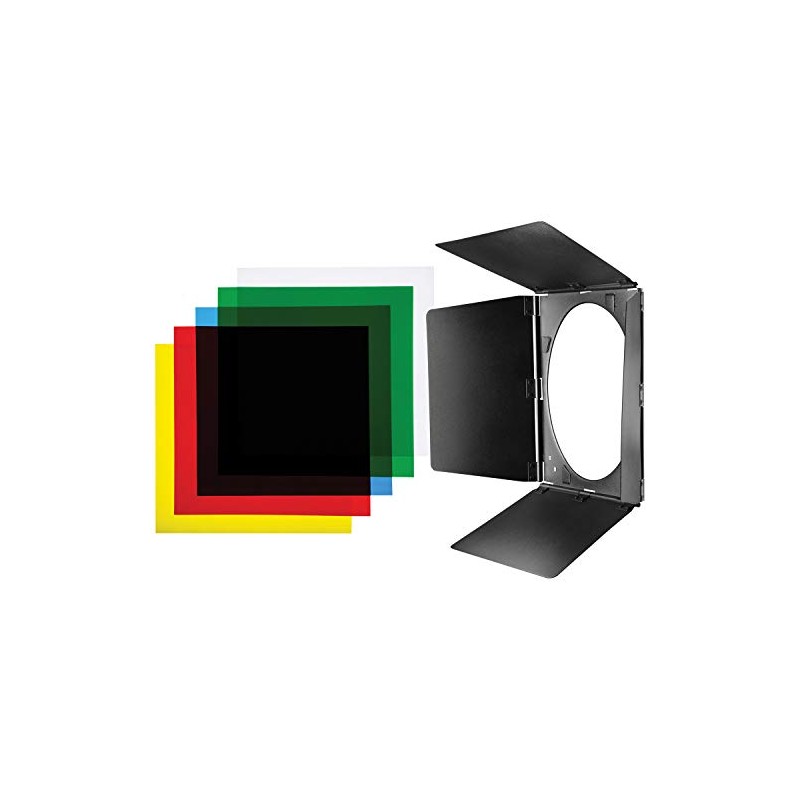 - Includes barndoors and red, blue, green, yellow, and diffusion gels