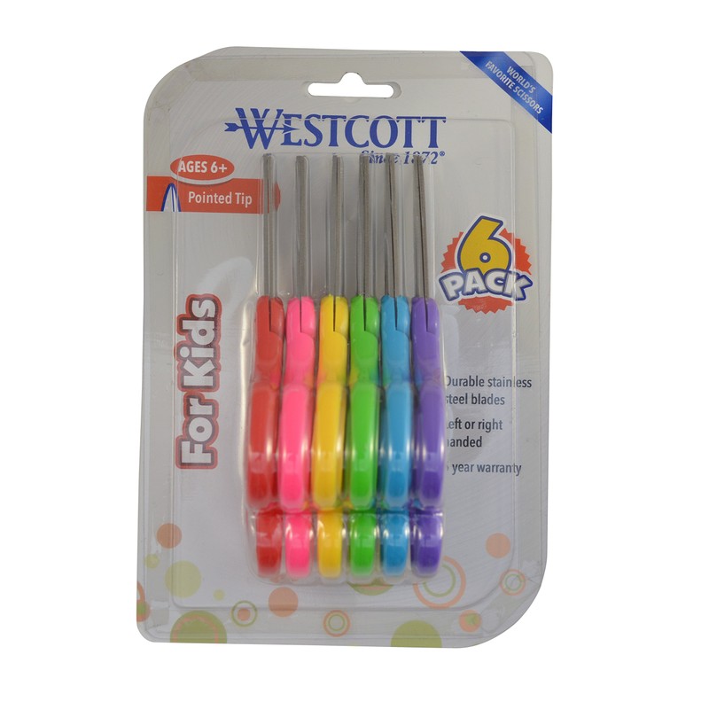 These 5" pointed-tip scissors are specially designed for a child's hand. The molded, asymmetrical handles allow for either left- or right-handed use. A safety-edge grind on the stainless steel blades makes them safer and reliable. These small scissors cut through paper, fabric, string, and other craft materials easily. Westcott is dedicated to supporting education and inspiring creative activities in the classroom and at home. Westcott products are specifically designed for growing students and created to be fun and functional with superior quality and exceptional value.