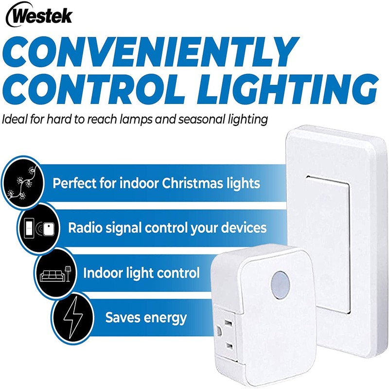 The Westek Indoor Wireless Wall Outlet Switch is an easy, convenient way to add switched outlet convenience to your home, allowing you to remotely operate and control indoor devices at the touch of a button. The wireless signal can pass through walls, doors, ceilings, floors and even around corners at a distance of 100 feet. This item is designed with you in mind, so that you can turn on your hard-to-reach lamp in the corner of the room from the comfort of your sofa, chair or even in another room. If you don’t have a light switch at the entry of a room in your home, no problem. Simply mount the switch onto your wall and you can turn on a lamp or plug-in light fixture at the touch of a button. No more fumbling around in the dark. It’s also great for persons with mobility issues and allows you to turn off appliances easier, saving energy consumption and money. And it’s super easy to install. Simply plug the desired appliance or lamp into the receiver and the receiver into any outlet. Use the switch to turn the device on and off. Simple. No wires and no need to call an electrician. Even better, it is discrete so you won’t even know it’s there. You can remove the appliance from the device at your convenience, or you might like it so much that you need to buy a second one. The transmitter is designed to look like an actual switch and switch plate and it will mount to any surface using the enclosed screws. A press of the transmitter's switch turns whatever you plugged into the receiver on or off - just like a hand wired switch and outlet. Once you have this item in your life, you’ll wonder how you ever lived without it.