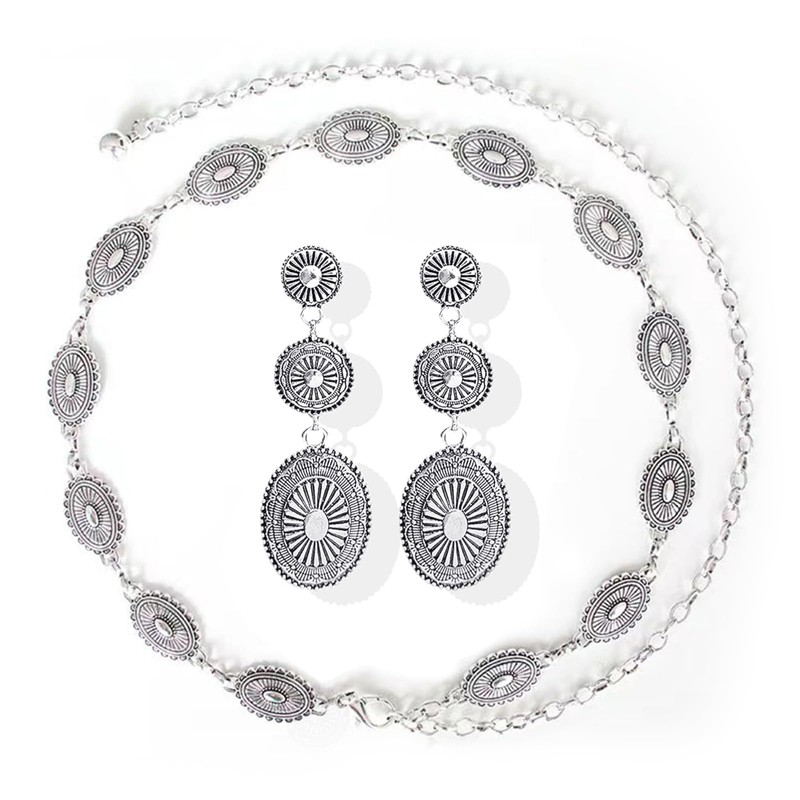 - Stylish Western Outfit for Women: Elevate your wardrobe with this essential set featuring a chic concho chain belt and a pair of exquisite western earrings. The classic concho design beautifully blends vintage charm with modern flair. Whether you choose to wear them together or separately, these pieces allow you to express your unique personality.