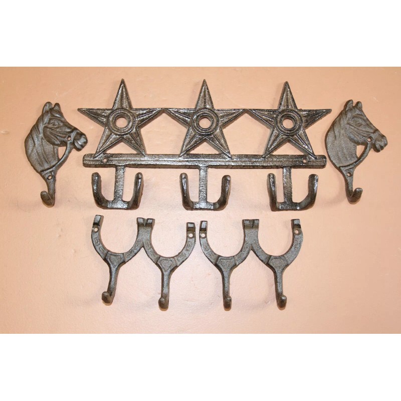 Approximate sizes - The western star wall hook bar - 6 1/4 inch by 11 /8 inch. The horse head wall hooks are 2 7/8 inch by 5 inch. The horseshoe wall hooks are 4 5/8 inch by 4 inch. These are hand-cast and the sizes may vary slightly.