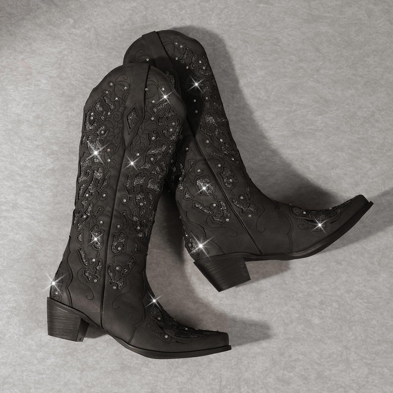 Western Cowboy Boots with Wide Calf Black Cowgirl Boots Women Sparkly Rhinestone Wedding Boots Trendy Vintage Tall Glitter Boots with Embroidery and Chunky Heel for Daily Wearing|Office|Party