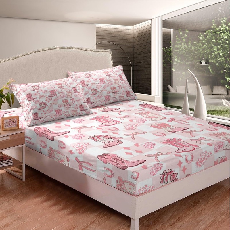 Western Cowgirl Fitted Sheet,Tribal Boots Caps Horseshoe Disco Cherry Sheet Set (No Flat Sheet) for Teens,Princess Bowknot Pink White Plaids Grids Bedding Set with 2 Pillowcases,Queen Size