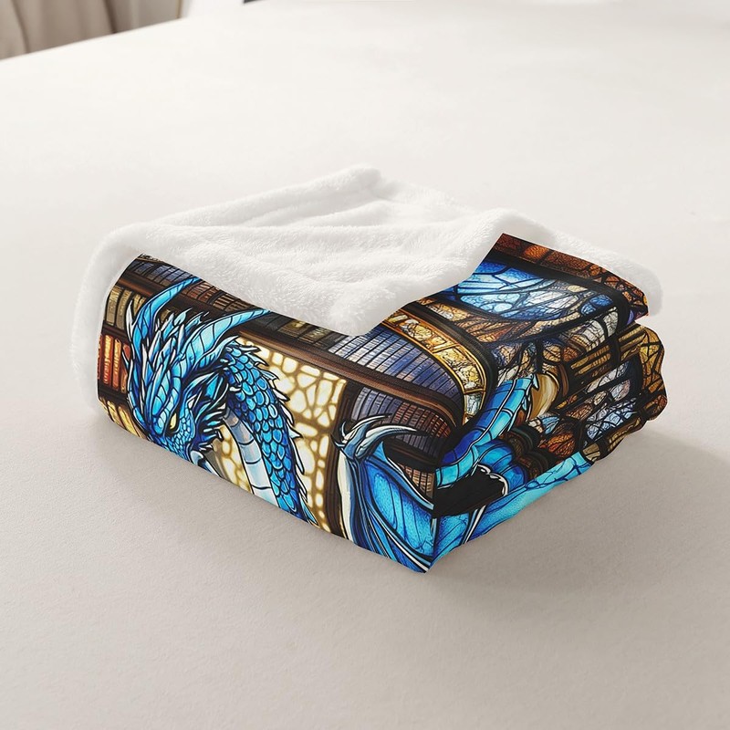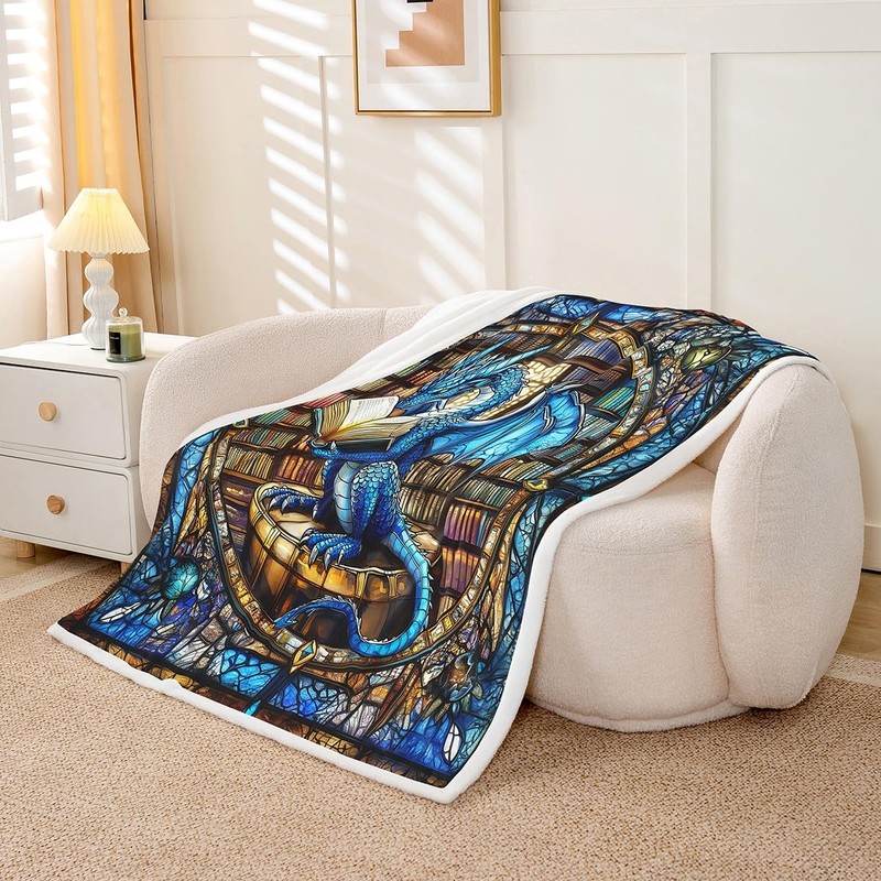 Western Dragon Kids Throw Blanket,Blue Dragon Reading Book Bookshelf Bed Blan...