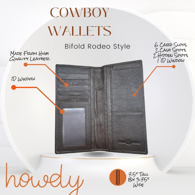 - Premium Full-Grain Leather: Crafted from premium full-grain cowhide leather, this wallet boasts a rich texture and durability that will age beautifully over time. Available in classic earth tones, it exudes a timeless Western charm.