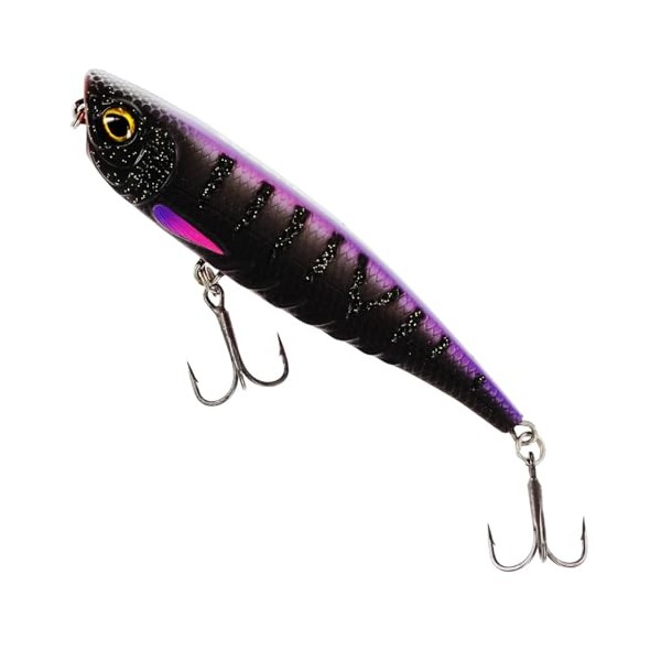 Surface bait for active predator fishLength:10cmWeight:15gFresh & salt water suitableLead-freeVery sharp and strong hookOversized, almost lifelike eyesRaised ribbing to generate turbulenceNose shovel produces pop noiseFull wire-through-body constructionLow frequency tapping soundLong throw designSimpleWalk-the-dog actionPackage includes: 1 Wobbler In your chosen colour