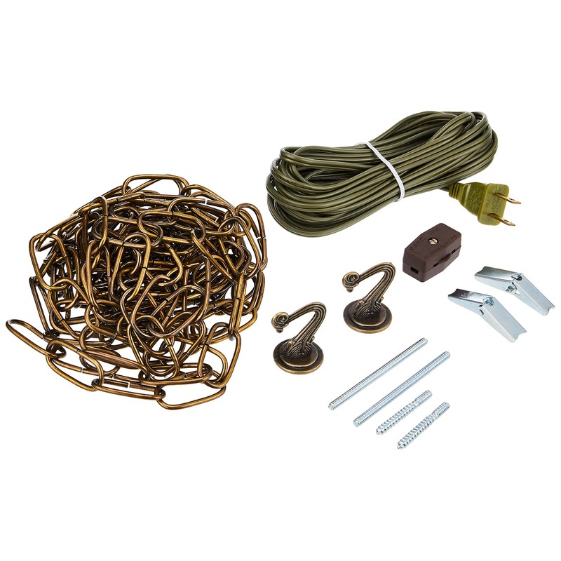 Antique brass finish Swag light kit, 15' chain, hooks, 20' cord with inline switch, Bagged.