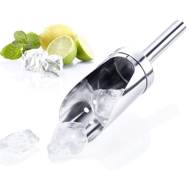 - Small perforated ice scoop made of rust-proof stainless steel specially designed for filling and portioning ice cubes and crushed ice for cocktails, long drinks, lemonades and other cool drinks in the kitchen and bar, at the buffet and at the party