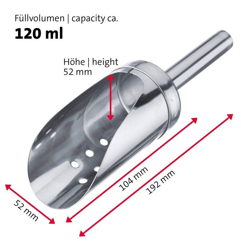 - Box contents: 1x Westmark ice scoop, stainless steel, 120 ml, with perforation, dimensions: 19.2 x diameter 5.2 cm, weight: 102 g, material: 18/8 stainless steel, colour: silver, 91222270