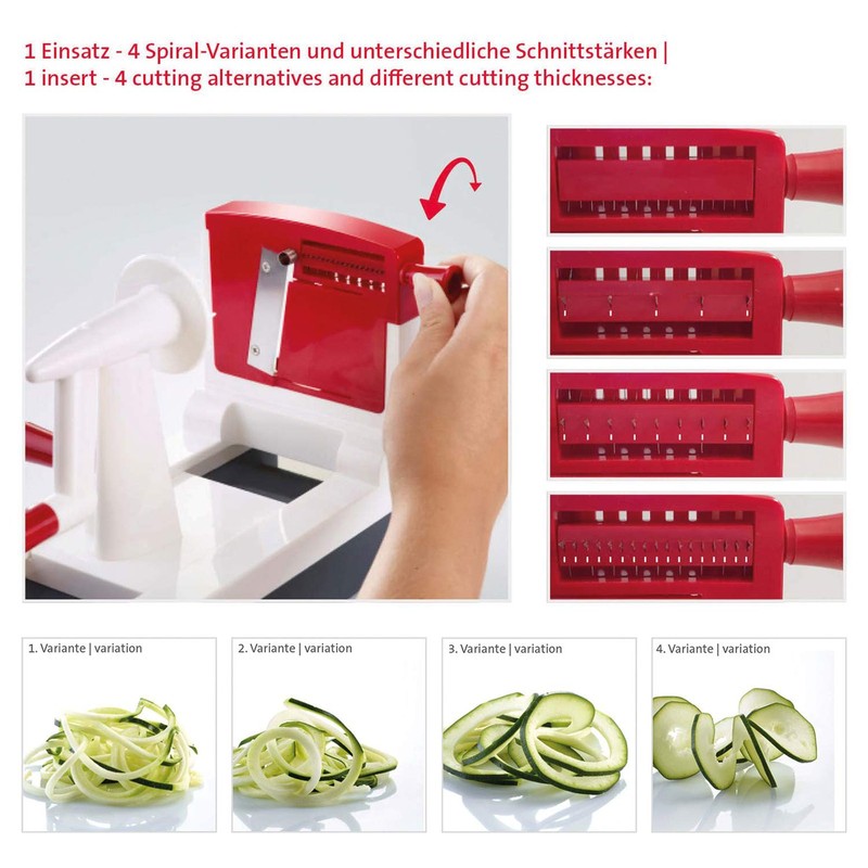 - Effortless, quick and silent preparation of food, special feature: 4 spiral variants with just one blade insert, with adjustable cutting thickness