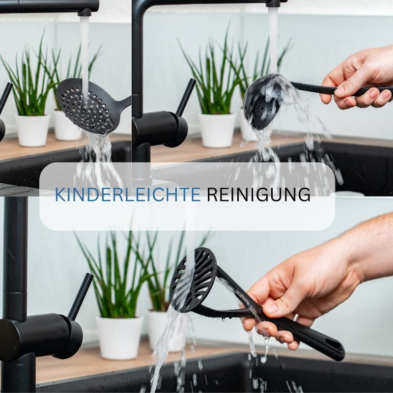 - Box contents: 1x Westmark mixing / cooking spoon, 1x spatula, 1x slotted spoon, 1x potato masher, 1x soup ladle, 1x spaghetti spoon, gentle, material: plastic (PA), colour: black, 283522E6