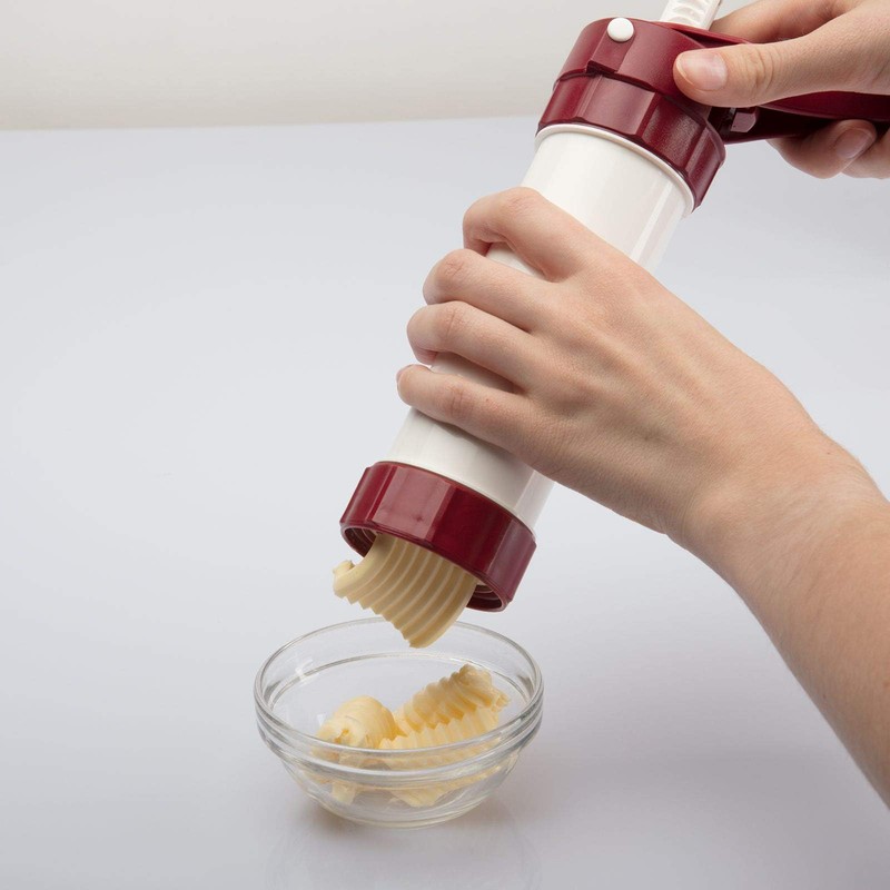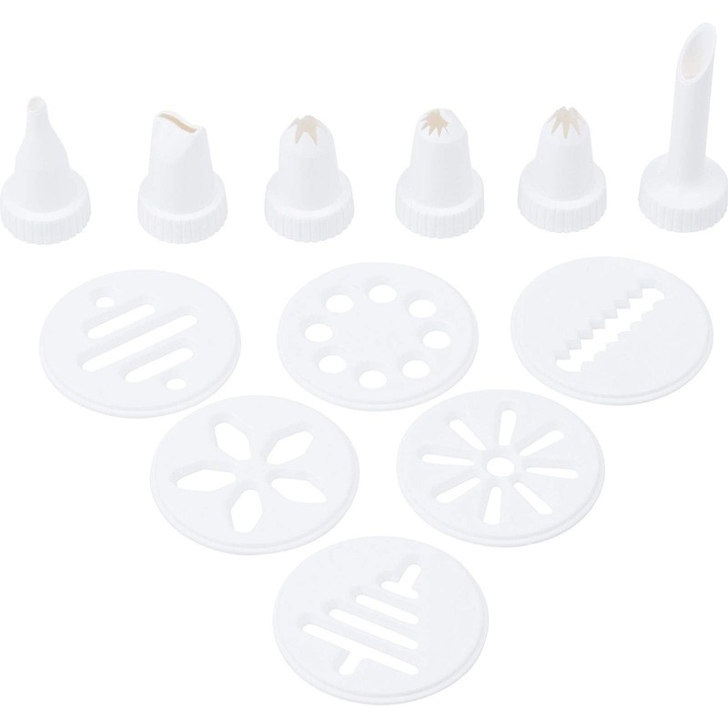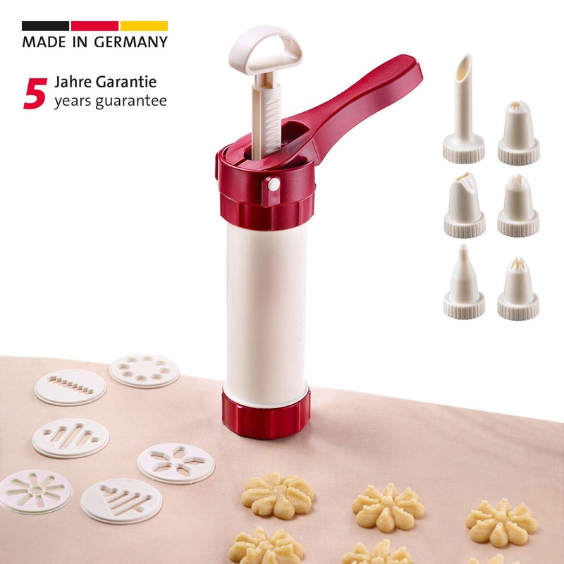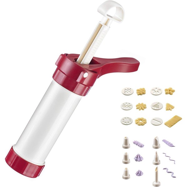 - Classic pastry press made of plastic with 6 moulding discs for making biscuits, can also be used as a garnish syringe for cakes, cakes, cupcakes and muffins thanks to 6 moulds and adapters